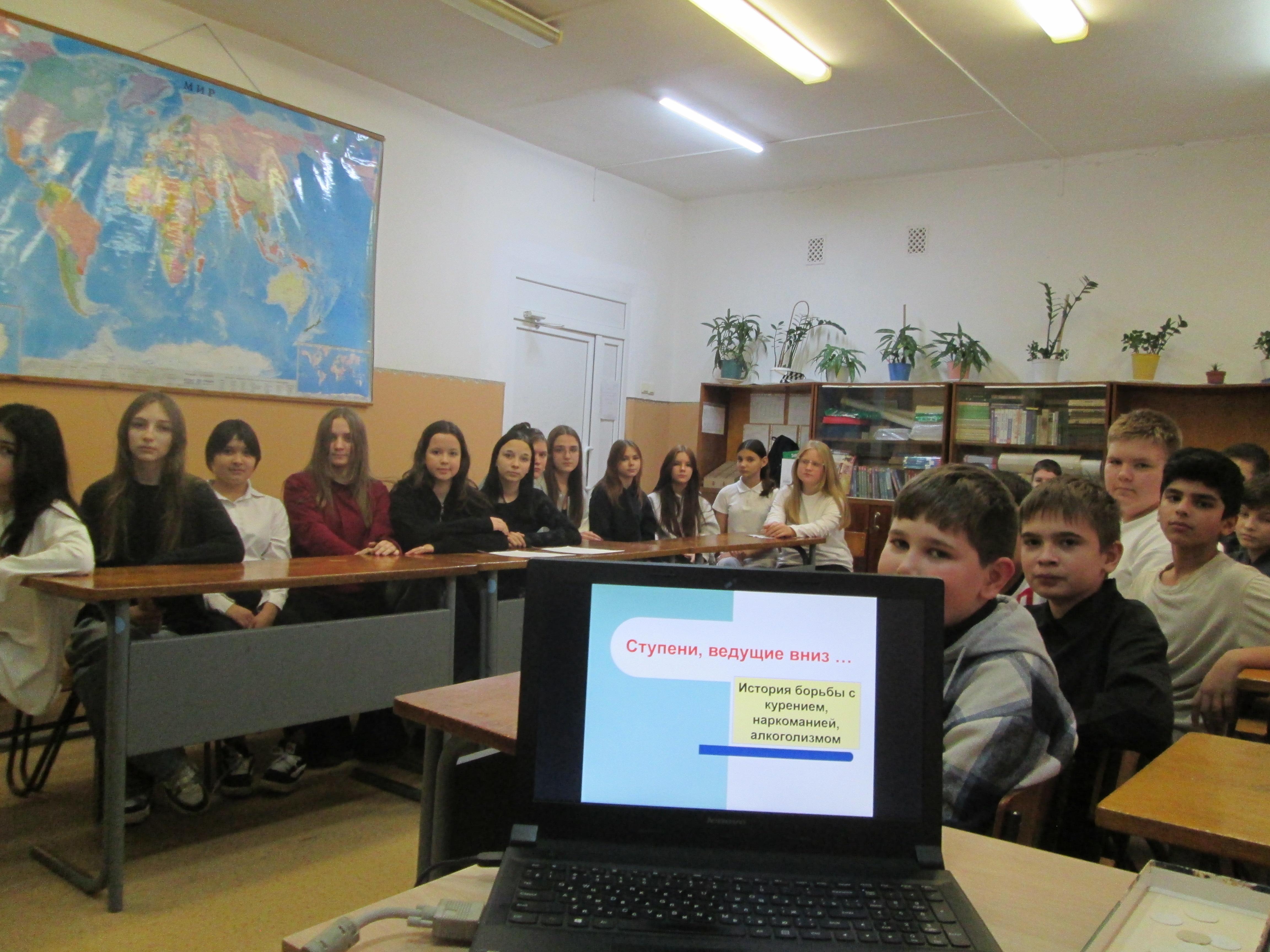 В рамках месячника профилактики наркомании, токсикомании, алкоголизма, а так же предметной недели истории и обществознания в 6 классе нашей школы 17 ноября 2025 г. было проведено открытое внеклассное занятие на тему “Ступени, ведущие вниз: история борьбы с курением, наркоманией, алкоголизмом”.
