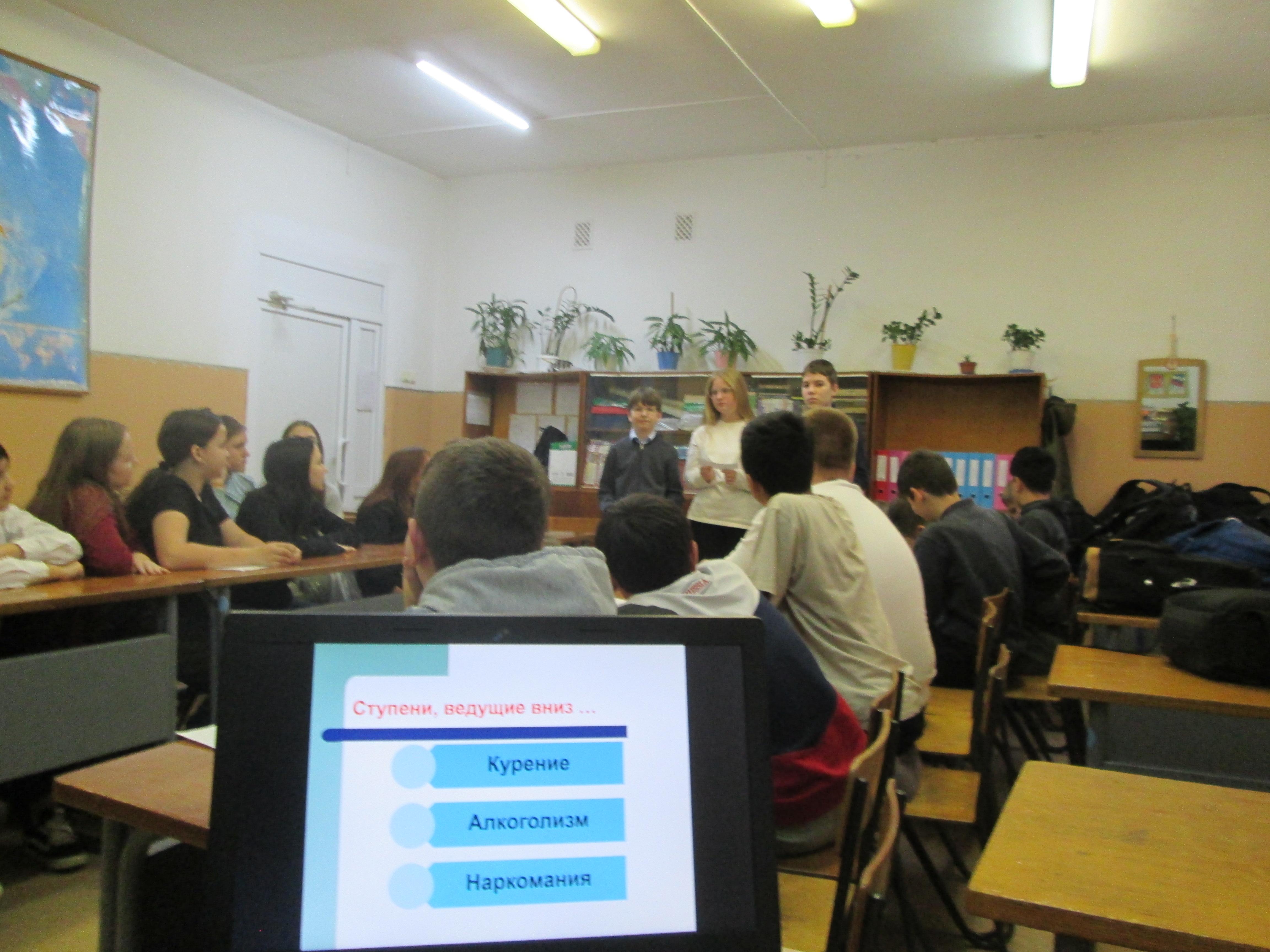 Занятие было проведено в форме командной игры (команды мальчиков и девочек). 1-й этап представлял викторину, содержащую вопросы борьбы с пагубными привычками. Затем команды представили выступления учащихся с информацией “Ступени, ведущие вниз: курение, алкоголизм, наркомания?”
