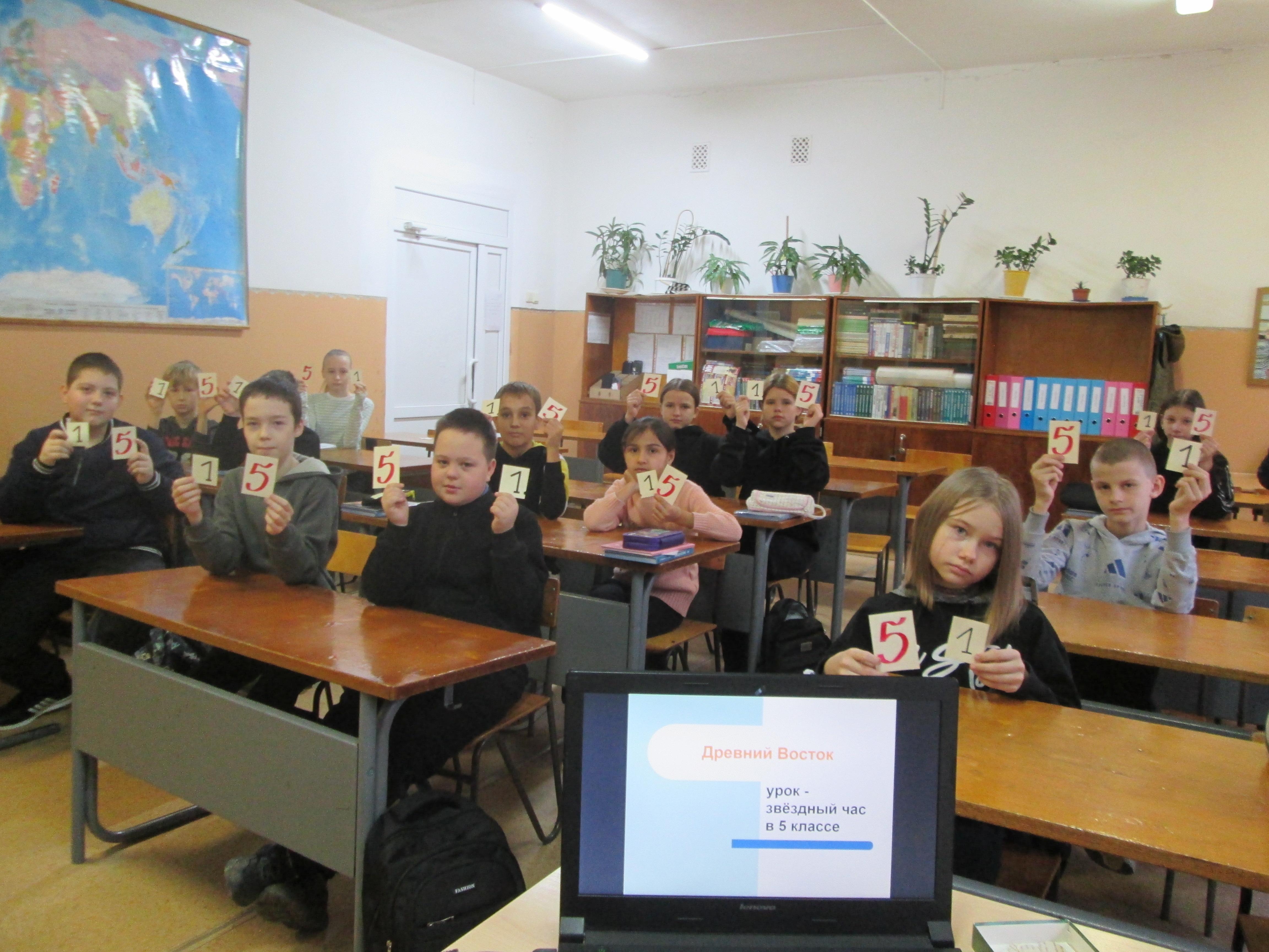 19 ноября 2025 года в 5 классе был проведён открытый урок истории на тему “Древний Восток”. Учитель истории и обществознания И.Б. Мелентьева провела этот урок в форме игры “Звёздный час”. Школьники соревновались в знании истории древних государств, выполняли логические и задания на смекалку, получая за правильные ответы звёздные жетоны. Победителями исторической Игры стали Самылин Никита, Тутаева Альбина, Щиров Александр.